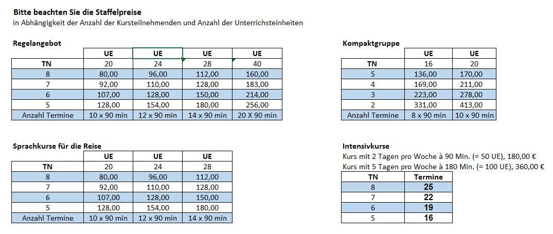 Intensivkurs Dies ist die Fortsetzung des Kurses Deutsch A2.1. Sie haben bereits solide Grundkenntnisse. Diese können Sie bei der Einstufungsberatung der vhs überprüfen lassen. Nach dem Kurs sind Sie in der Lage, über Tagesablauf und Freizeitaktivitäten zu berichten, Reiseprospekte und leicht verständliche Anzeigen zu lesen und zu verstehen. Im Rahmen dieses Kurses zielen die schriftlichen und mündlichen Übungen darauf ab, Ihre lexikalischen, grammatikalischen und landeskundlichen Kenntnisse und fremdsprachlichen Kompetenzen zu erweitern. Die Kursgebühr muss bei der Anmeldung in der Geschäftsstelle bezahlt werden. Testen Sie Ihre Kenntnisse unter: https://www.hueber.de/schritte-plus-neu/einstufungstest